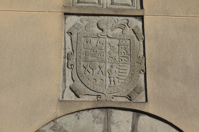 Derriba da porta principal, hai un escudo "de armas y blasones"