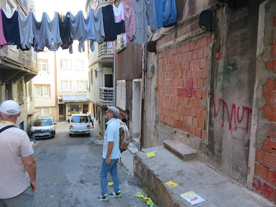 Aquí tivemos tempo libre e sabíamos que estábamos moi cerca do barrio onde se rodou a serie turca "Mujer" que tanto éxito tivo no noso país. Valéndonos do móbil, sen preguntar a ninguén (era difícil, jeje...non sabemos turco e o inglés dos 5 que íamos é moi básico) chegamos en aprox. 3 minutos ao barrio de Tarlabasi. É incrible que en apenas uns metros pasemos dunha zona moderna, coidada, moi frecuentada a outra zona marxinal onde moita xente vive da recollida de residuos. Poucos turistas chegan aquí e a verdade é que nos pareceu que non é moi seguro achegarse a esta zona.